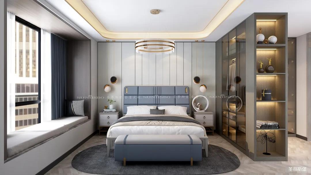 卧室的设计继续延续着空间的高级灰,蓝灰色彩的对比,让主卧空间层次感更加丰富,充足的阳光随意散落,空间更加温暖大气,对称的球形吊灯设计,恍如两个“快乐星球”,展现着空间应有的艺术性,设计师巧妙地设计,营造出与众不同的生活品质。