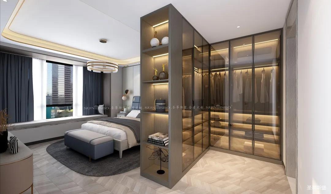 设计师不浪费每一寸空间,将主卧的大空间划分出一个步入式的L型衣帽间,当即隔断了进门对床的尴尬,满足了我一直以来拥有独立衣帽间的梦想,它不仅是个收纳场所,更是卧室的质感体现。