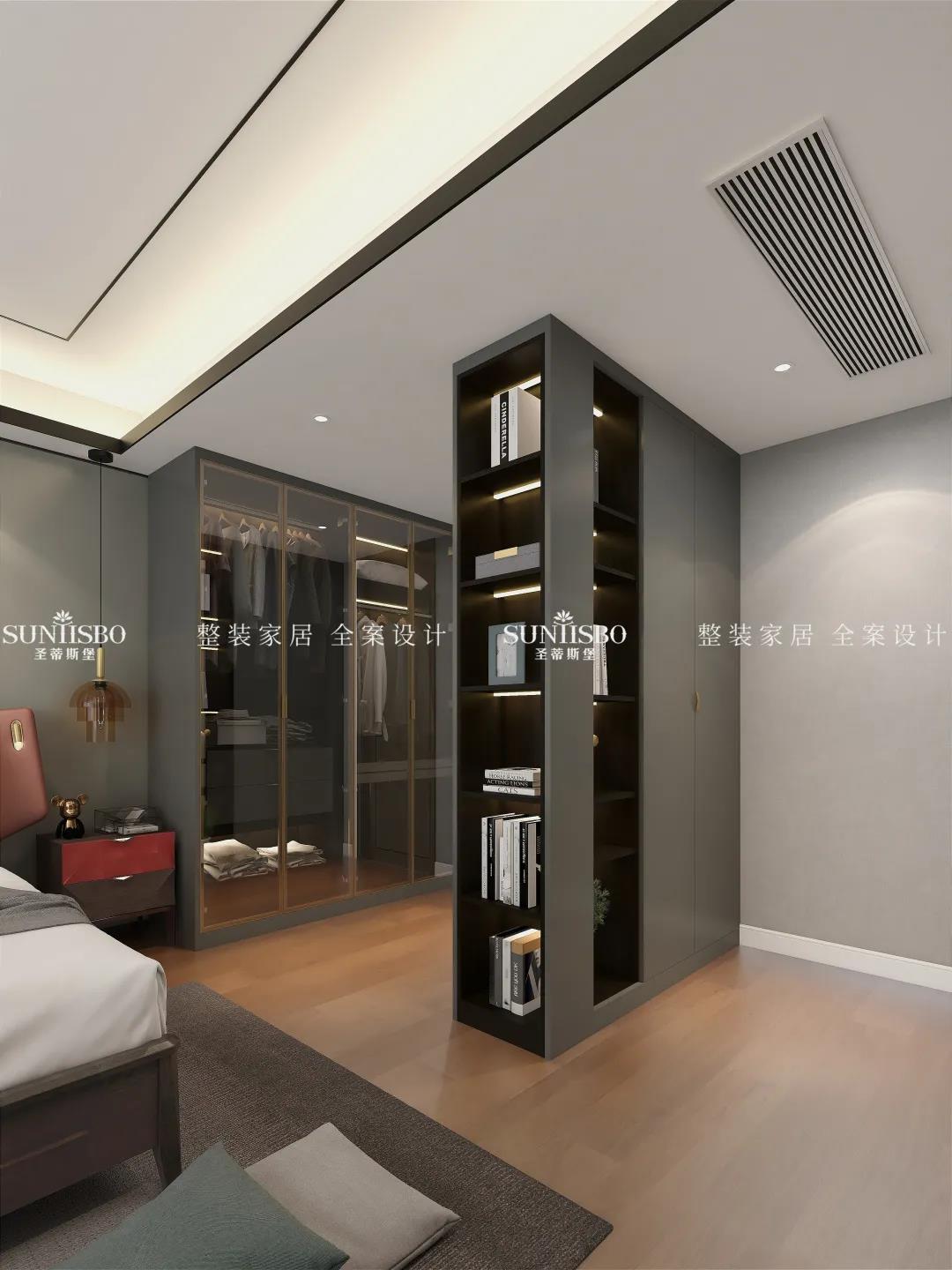 主卧的床是意式轻奢时尚与东方雅韵极致融合,没有半点突兀和乖张。,意大利最出名的便是它的工艺与设计,时尚的莫兰迪色系、轻奢金属的运用,体现娴熟的意式家具设计底蕴,两者之间融合的相得益彰。
