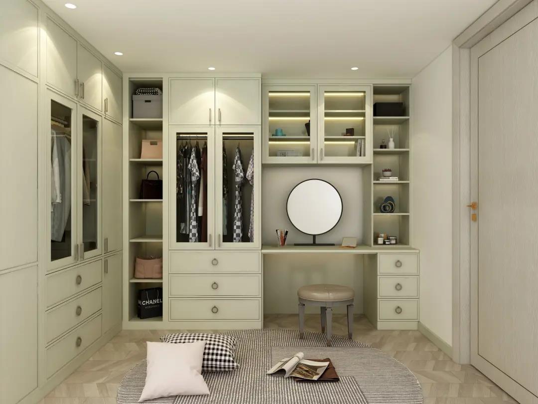 主卧衣帽间的衣柜结合妆台一体设计,